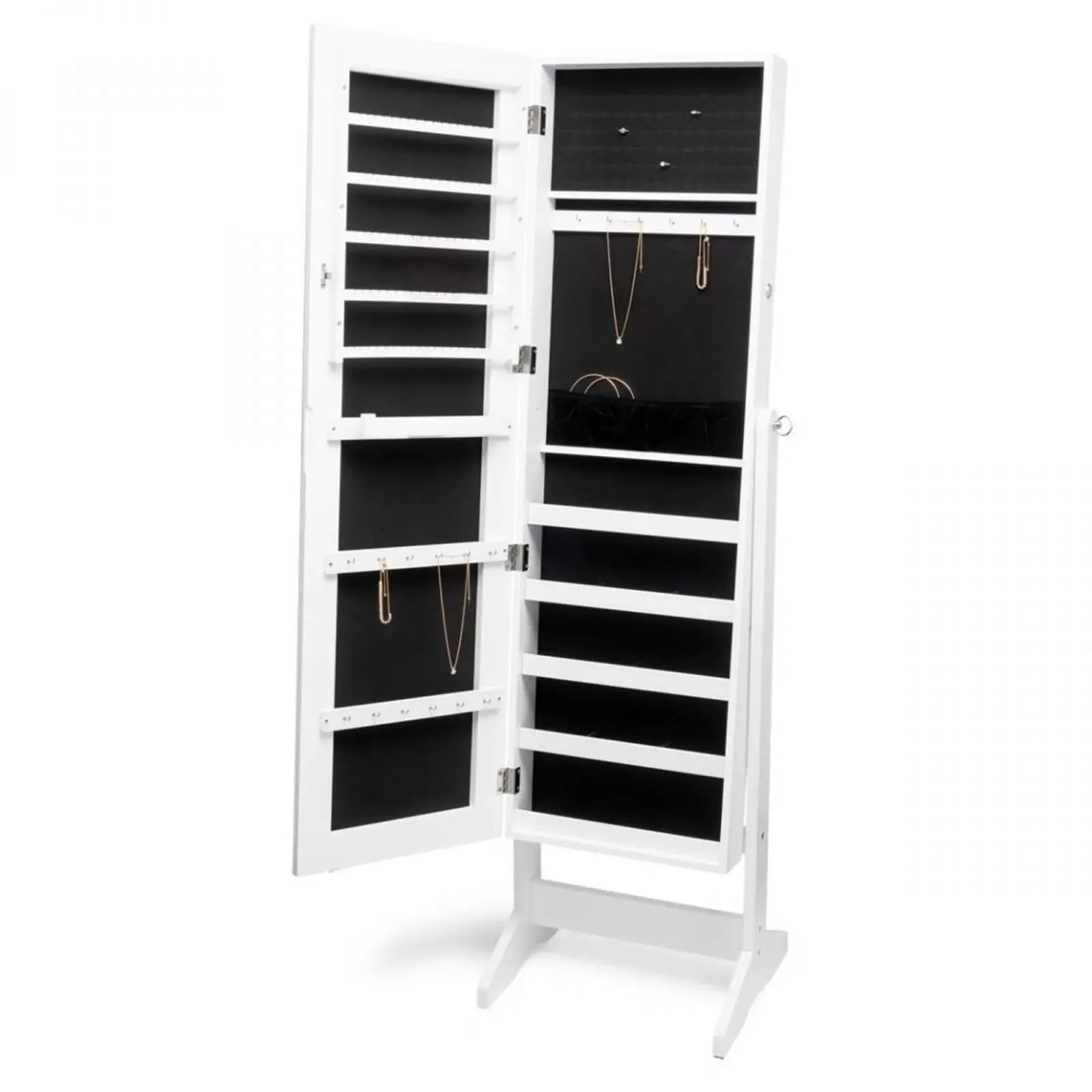 Stop everything! Take a look at your appearance and then take a look behind the little door; this LED mirror is nothing more and nothing less than an incredible jewelry cabinet, fully lined in velvet and with several hooks and compartments to keep your "sparkles" organized and well-stored. Everything you need in one place. In addition, it has an LED strip next to the mirror to make you even more radiant. To turn it on, simply plug it in, click the switch, and you're done!